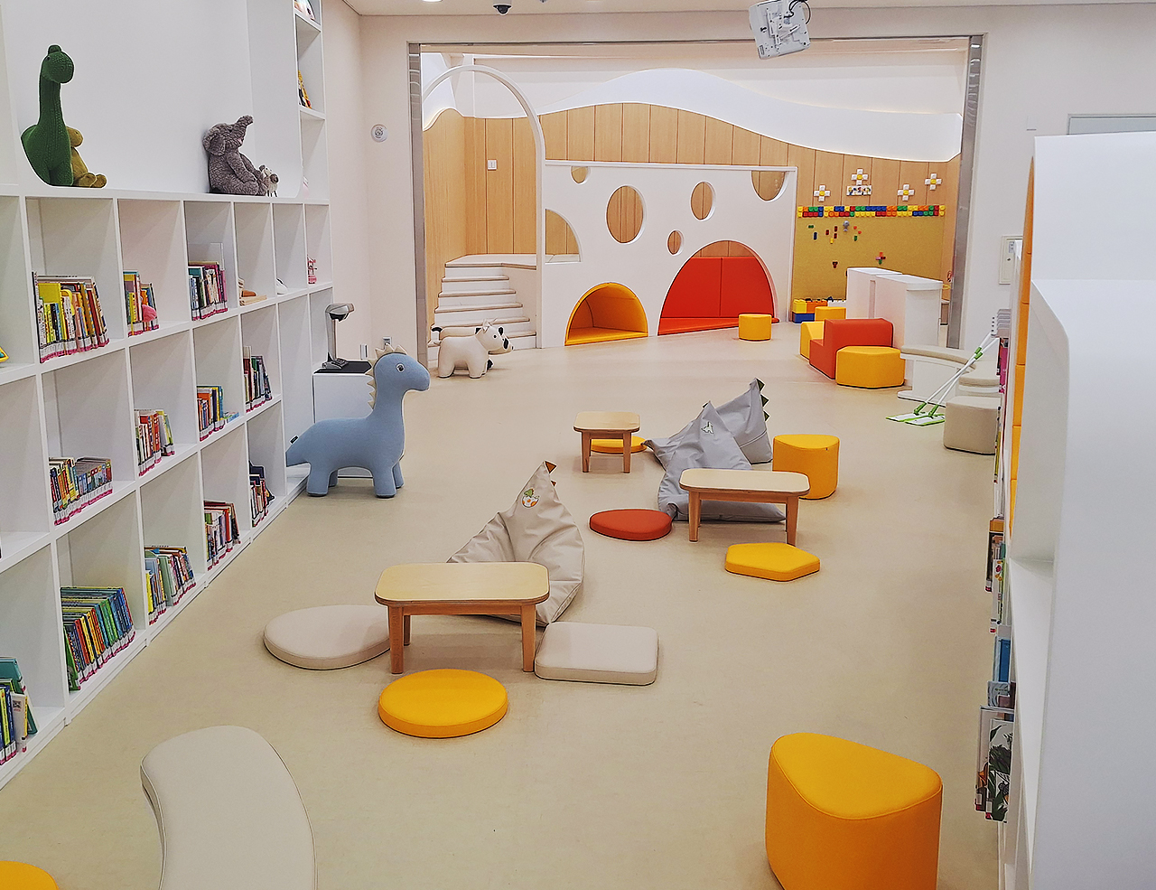 2층에 위치한 영유아 자료실은 구불구불 강물을 따라 쉼터가 있는 자연을 담은 놀이형 독서공간 입니다.