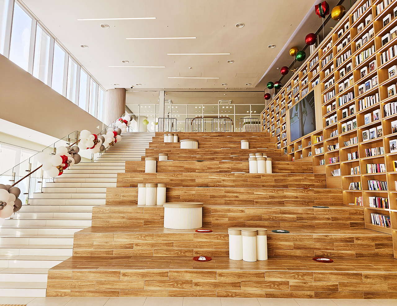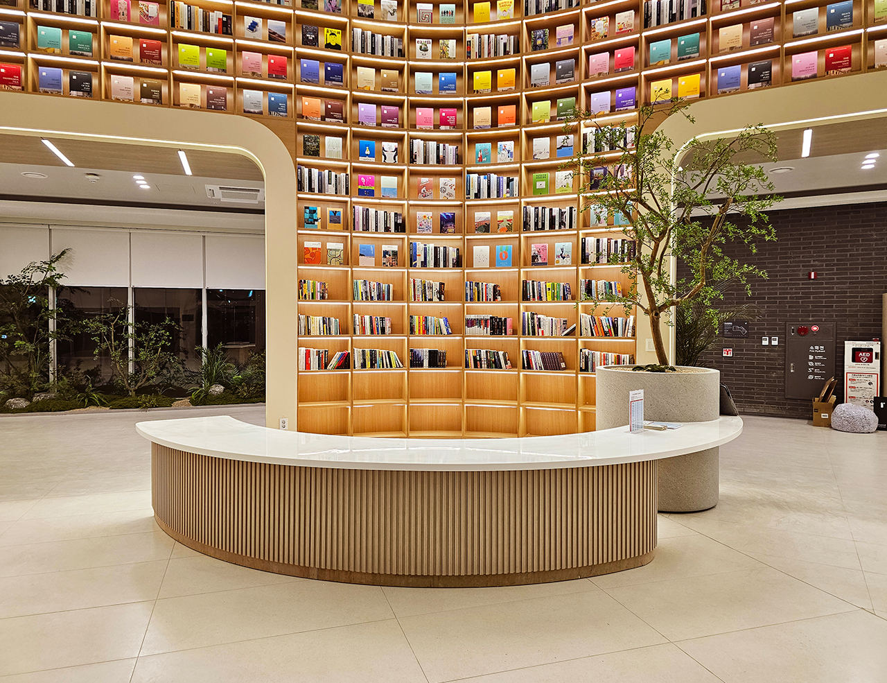 자연을 담은 카페 공간은 주변 공원과 도심 속의 휴식을 제공하고, 로비 메인 홀에는 공간은 압도하는 벽면 디자인 서가의 배치를 통해 인문학 도시 포천의 의미를 강조합니다.