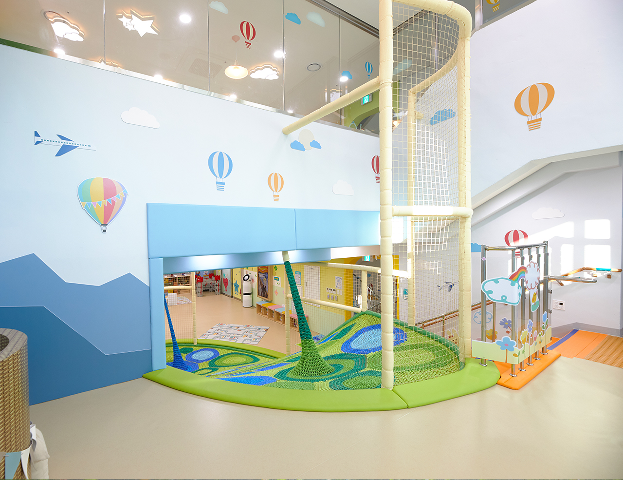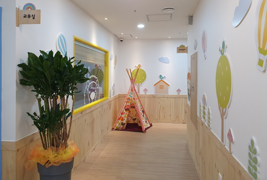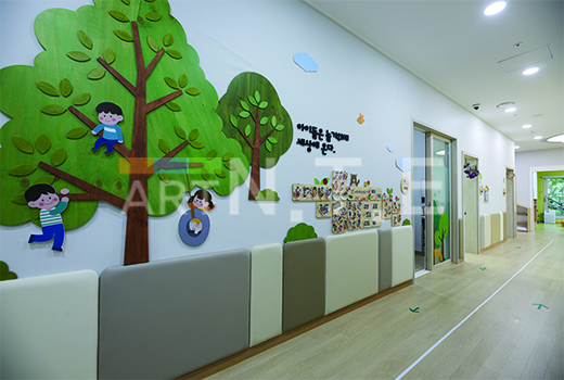 벽에는 아이들의 눈높이에 맞는 아기자기한 사인물들을 설치하고 안전사고를 방지하기 위해 복도 및 모든 공간 하부에는 안전 쿠션을 설치하였다.