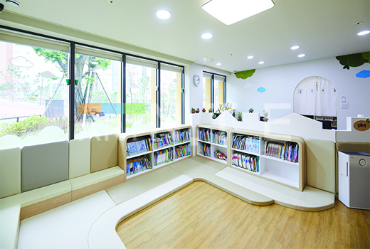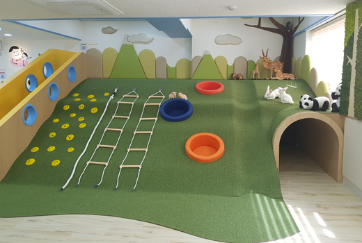 화이트 톤의 벽과 우드 패턴의 바닥 마감을 하였고, 자연계열의 색감을 사용하여 아이들에게 자연 친환경적인 환경을 구성하였다.