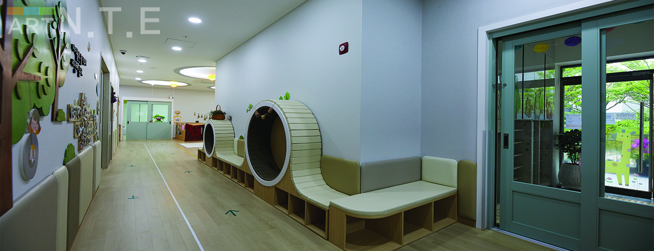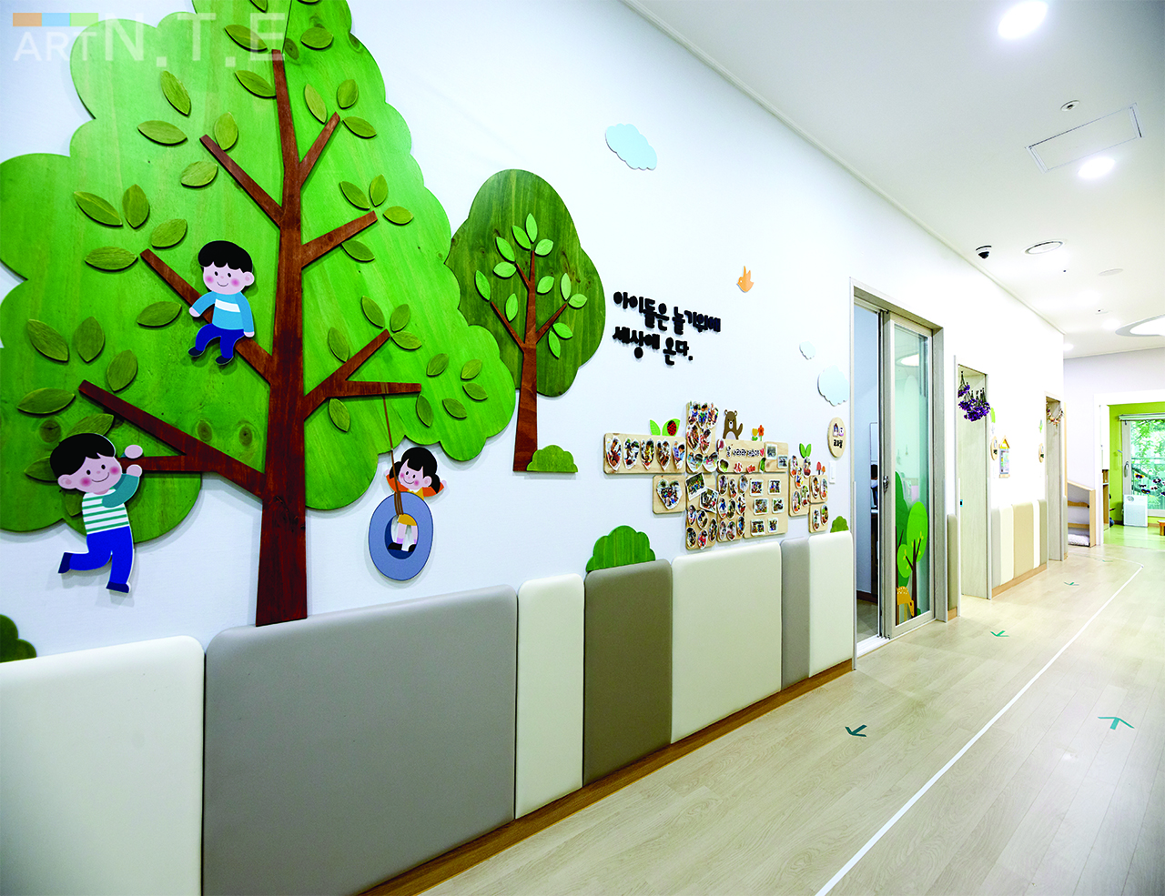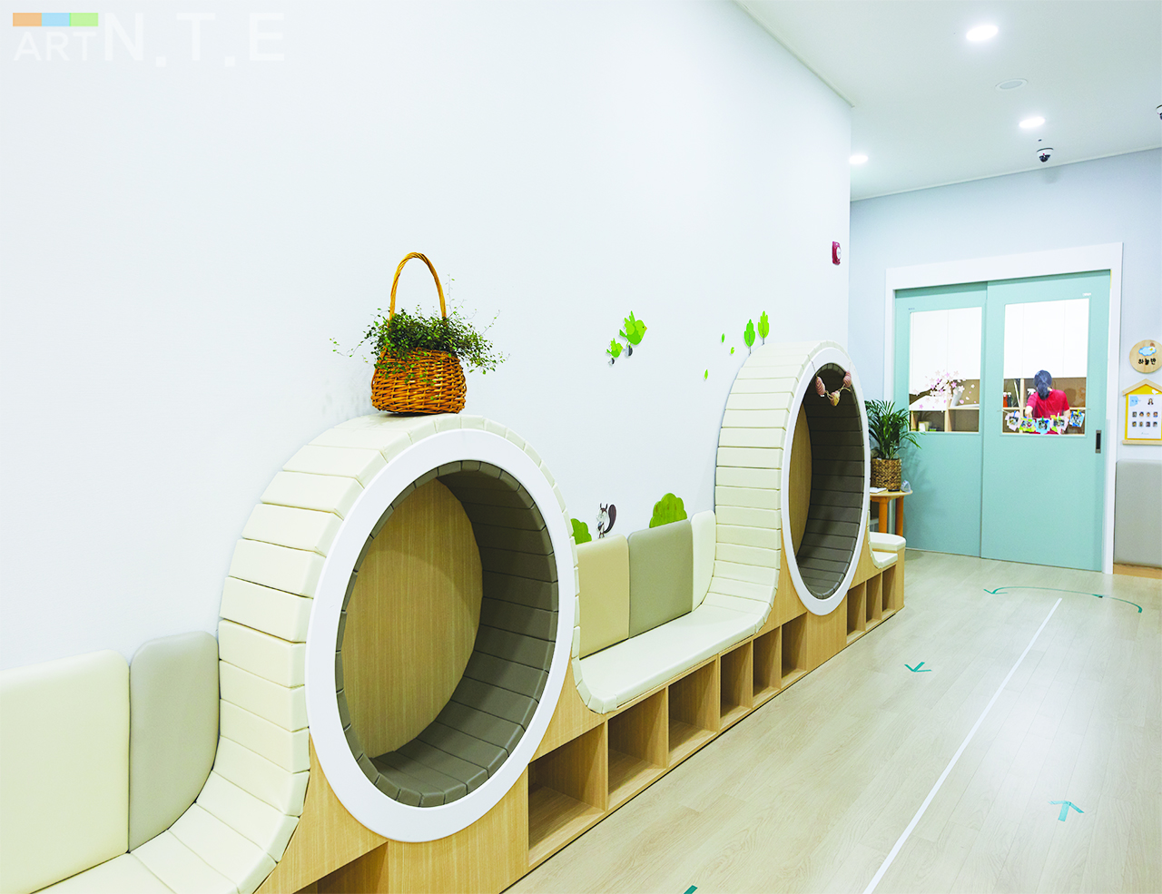 화이트 톤의 벽과 우드 패턴의 바닥 마감을 하였고, 자연계열의 색감을 사용하여 아이들에게 자연 친환경적인 환경을 구성하였다.