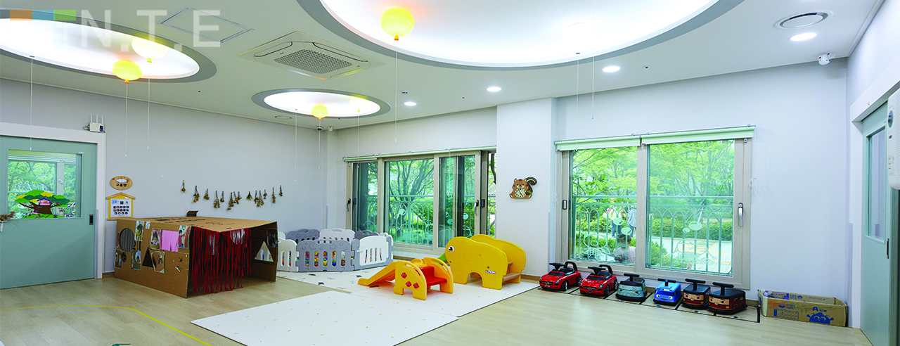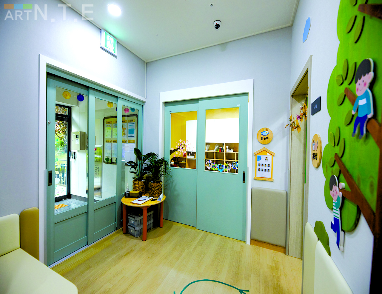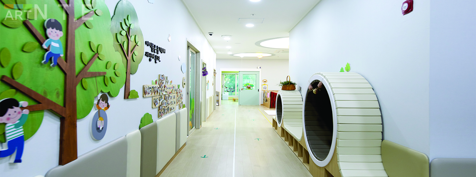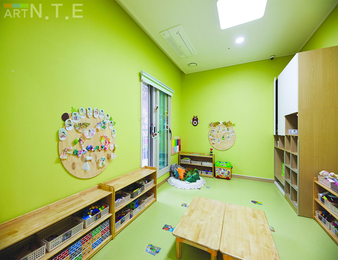 화이트 톤의 벽과 우드 패턴의 바닥 마감을 하였고, 자연계열의 색감을 사용하여 아이들에게 자연 친환경적인 환경을 구성하였다.