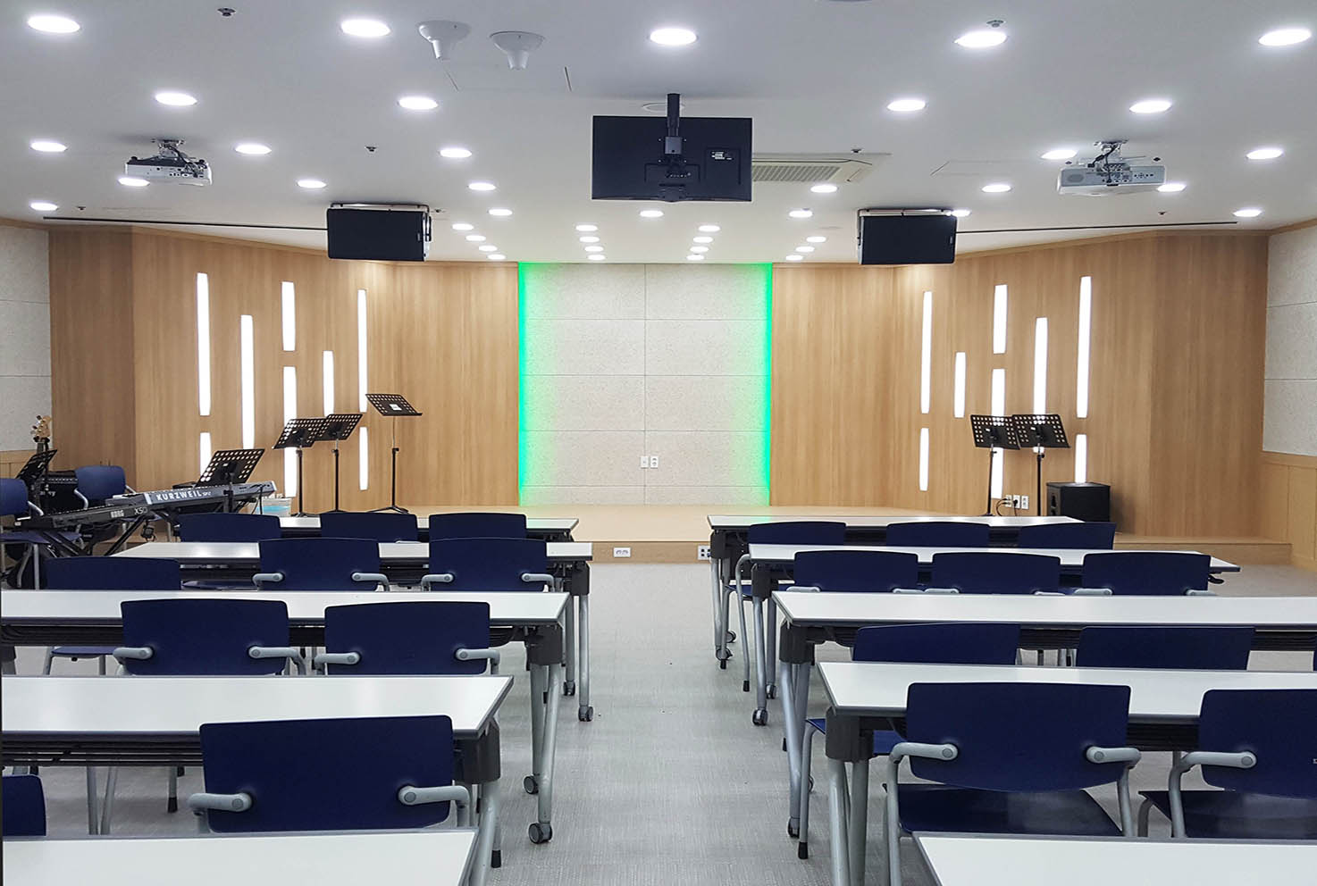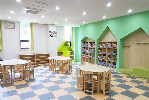 전체적인 색감을 한색과 난색의 조화를 이루도록 구성하여 따뜻하면서도 생동감 넘치는 분위기를 구성하였습니다. 박공지붕 형태를 가진 붙박이 서가와 소파는 시각적으로 편안함을 주는 녹색 컬러를 사용하여 독서하기에 적합한 공간으로 제작하였습니다.