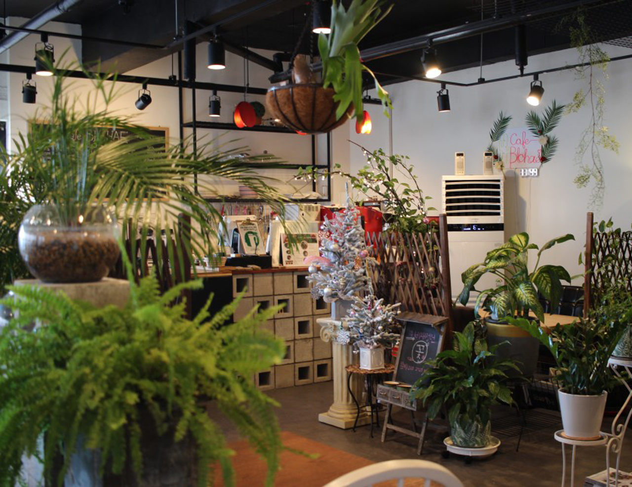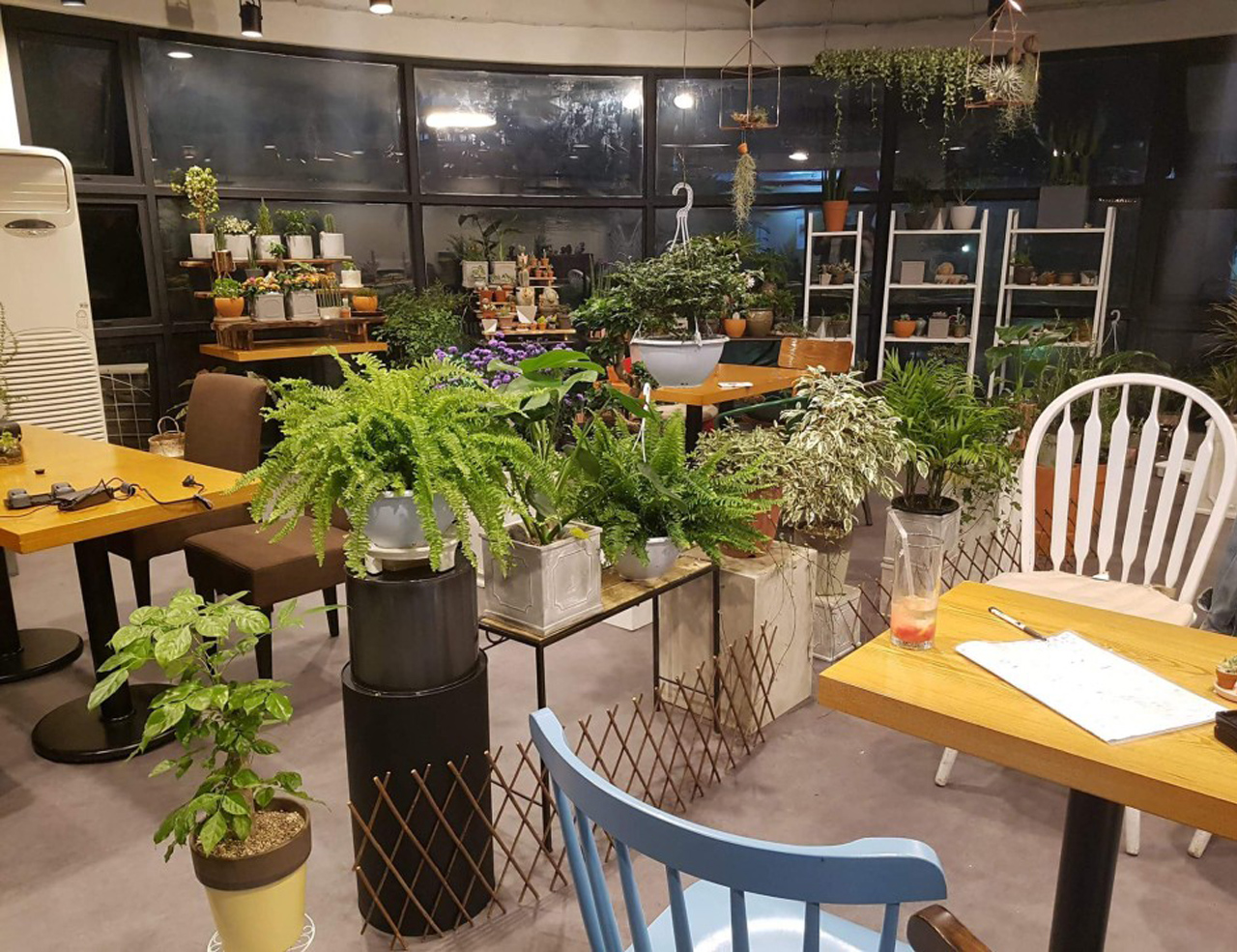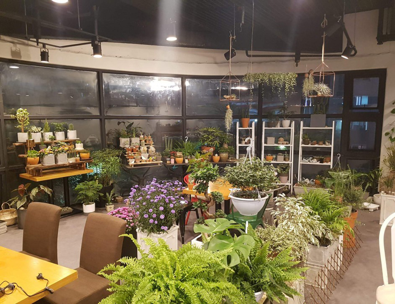 또한 벽면은 화이트 계열로 하여 식물에 색에 겹치지 않도록 하였고 우드와 콘크리트 장식장, 매쉬 천정을 이용하여 따뜻한 인더스트리얼 느낌을 연출하였습니다.