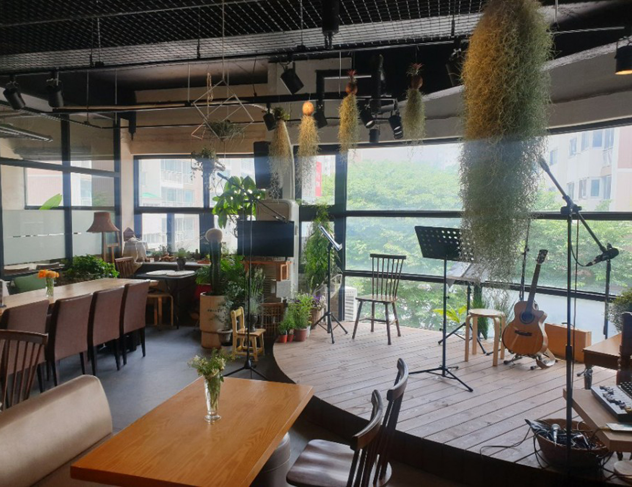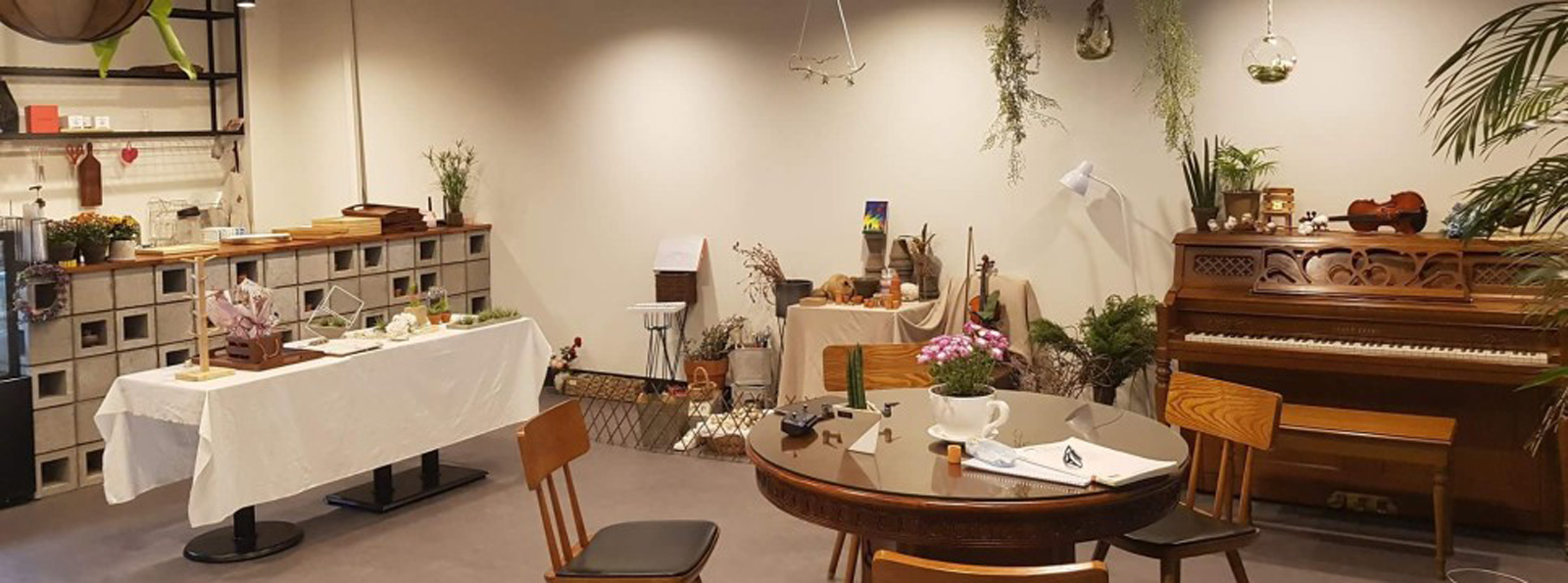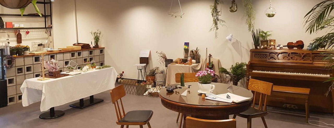 또한 벽면은 화이트 계열로 하여 식물에 색에 겹치지 않도록 하였고 우드와 콘크리트 장식장, 매쉬 천정을 이용하여 따뜻한 인더스트리얼 느낌을 연출하였습니다.